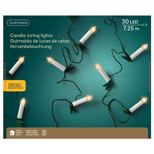 Candeline per albero di natale. Filare da 7,25 metri con 30 luci, ciascuna candelina ha una clip per appenderla all’albero di natale, colore bianco caldo, cavo verde. Uso interno.