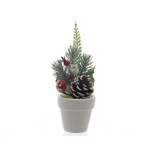 Decoro Natalizio con vaso composto da ramo di pino, funghetto, bacche, felci e pigna. cm. 16,
