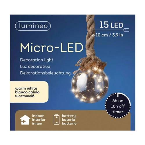 Decorazione Palla natalizia luminosa, colore grigio fumo con corda e 15 luci led bianco caldo con timer programmato per 6 ore di accensione. Funziona con 3 batterie AA (non incluse). Uso interno.