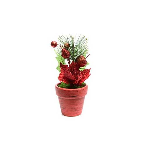 Stella di Natale in vaso con decori rossi, cm. 6,5 x 16.